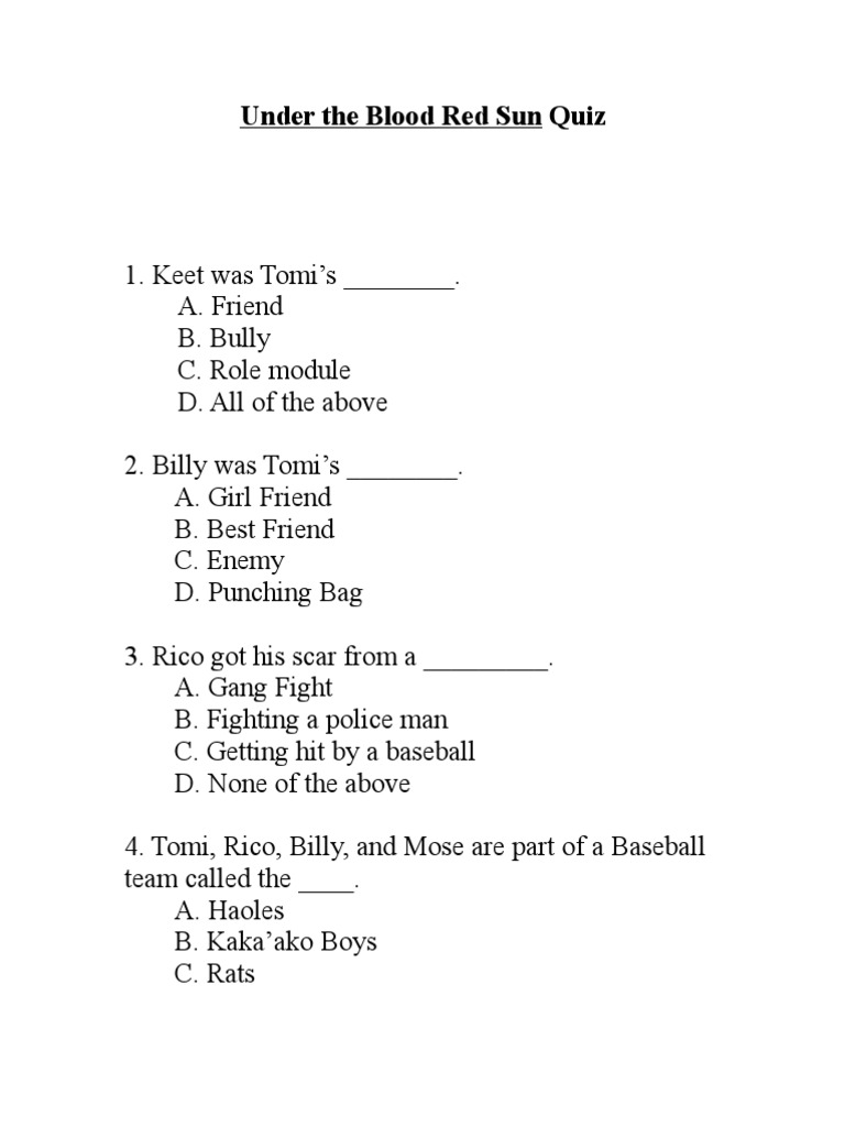Jacob Ind Murder Case - Free Under the Blood-Red Sun study unit worksheets for teachers to print. Comprehension by chapter, vocabulary challenges, creative reading response activities and projects, tests, and much more! Under the Blood Red Sun Quiz (15%) Date: Name: _____ Multiple Choice Questions (1 mark each) 1. What does âhaoleâ mean? a) Asian b) White c) Rude d) Rich 2. Which character owns a gun? a) Billy b) Jake c) Keet d) Tomi 3. Which characters are cousins? a) Mose & Jake b) Billy & Tomi c) Jake & Billy d) Mose & Rico 4. What type of fish does. Aug 15,  ¡ Under the Sun Topics: Emotion, Student, We Are the World / Pages: 6 ( words) / Published: Aug 15th, Continue Reading Wake Up Call A right direction can provides us with unique and powerful challenges to grow and contribute. Makes us aim our efforts, give of ourselves, and create meaningful relationships and changes. The Fall Of Don Juan Analysis