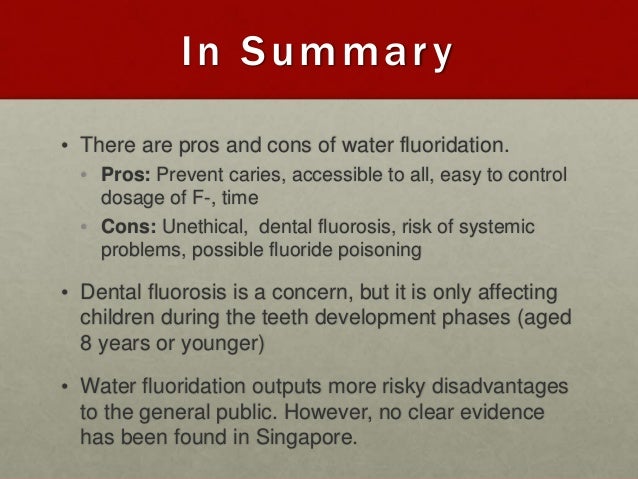 Paul Ekmans Four Basic Emotions - The Pros of Fluoride. Adding a small amount of fluoride to water that does not have a significant amount in it naturally is one of the simplest ways to improve the dental health of the public. Fluoride strengthens tooth enamel. It helps to prevent many dental maladies such as tooth decay, cavities, and diseases that lead to tooth teilnehmer.somee.comon: 99 Hillside Ave. Suite A, Williston Park, , New York. Jun 07,  · The pros of fluoride Mixing a tiny part of fluoride with water that contains no significant amount of fluoride is one of the easiest ways to improve the oral health of the people in the community. Fluoride helps to fortify the teeth enamel, which makes it possible to fight off dental issues like cavities, tooth decay and any disease that may Estimated Reading Time: 3 mins. Pros and Cons of Fluoride in Drinking Water Fluoride is used in systemic and topical fluoride therapy to prevent tooth decay and is found in various products related to oral hygiene. In some states where big, centralized water delivery systems are not common, the mineral compound is added to table teilnehmer.somee.comted Reading Time: 4 mins. Medicaid Vs Medicare